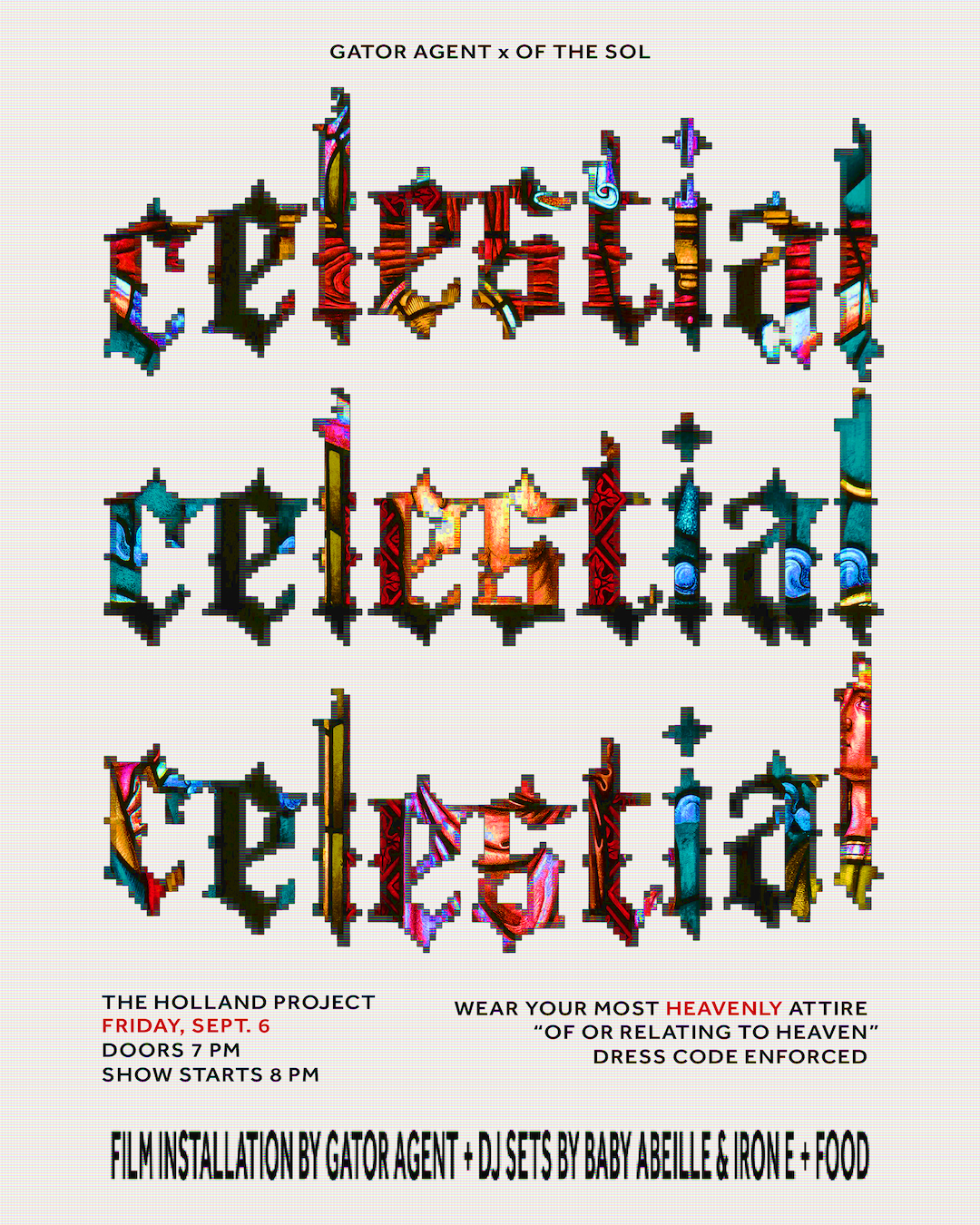 While most films are showcased traditionally in a theatrical setting, Celestial was held in the HP Gallery for a special one-night-only dance experience. The event included a strict “Heavenly” dress code, loud booming speakers, fog, 3 projectors, live DJ performances by Baby Abeille & IRON E, and the unforgettable film & music score.